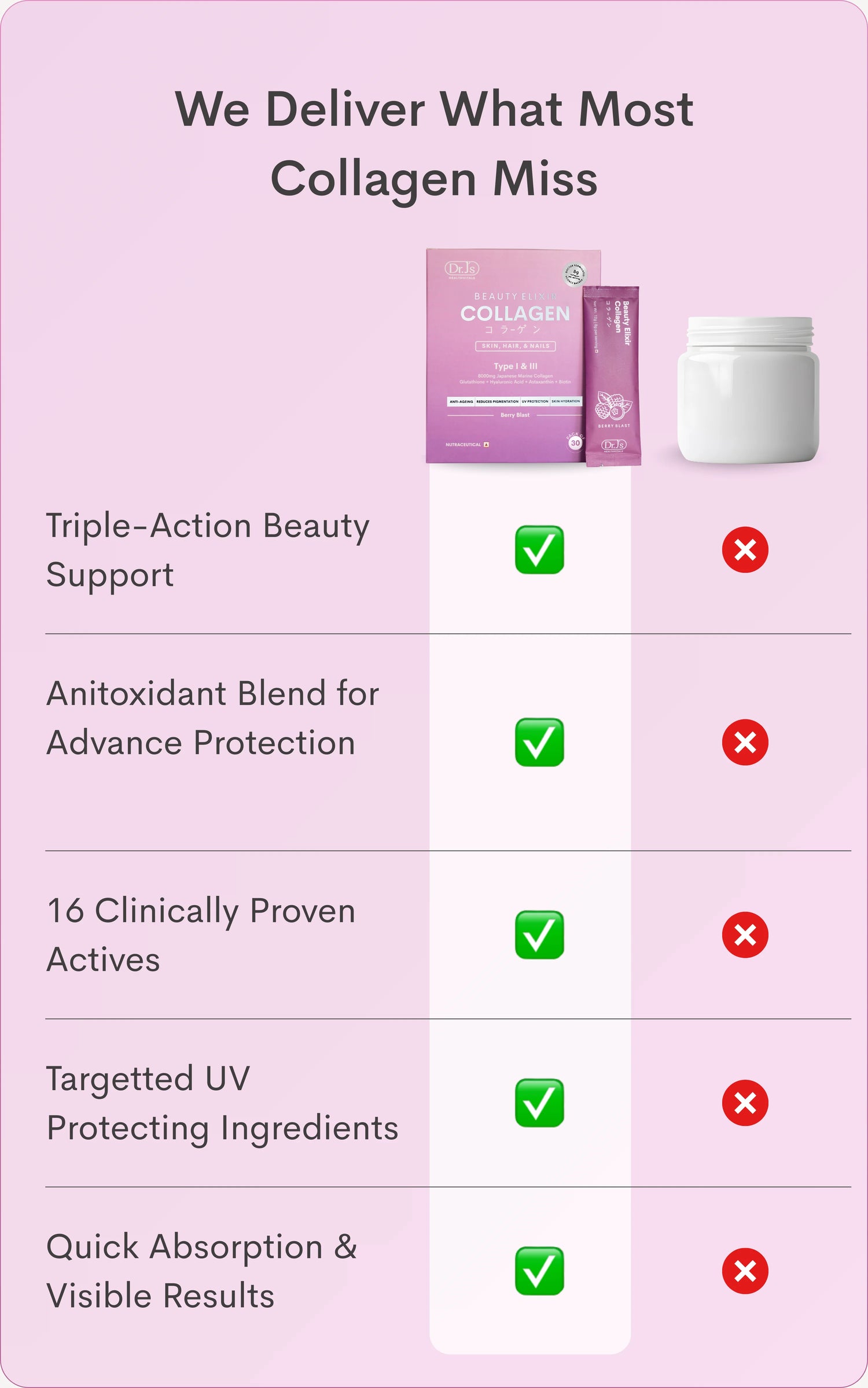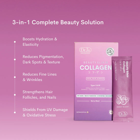 Dr. J’s Collagen delivers 8000mg of high-quality hydrolysed collagen peptides sourced from Japan, known for their superior absorption and bioavailability. It is enriched with antioxidants, vitamins, and nutrient-rich botanicals that work together to boost radiance & skin elasticity, strengthen hair and nails, and provide protection against UV damage. It is also tested to be heavy metal free, ensuring maximum safety and purity.