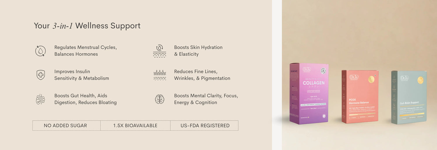 Gut, hormones, and collagen work in sync to deliver lasting results. Better digestion, steady cycles, stable energy, smoother skin with reduced pigmentation and fine lines, and stronger hair & nails.