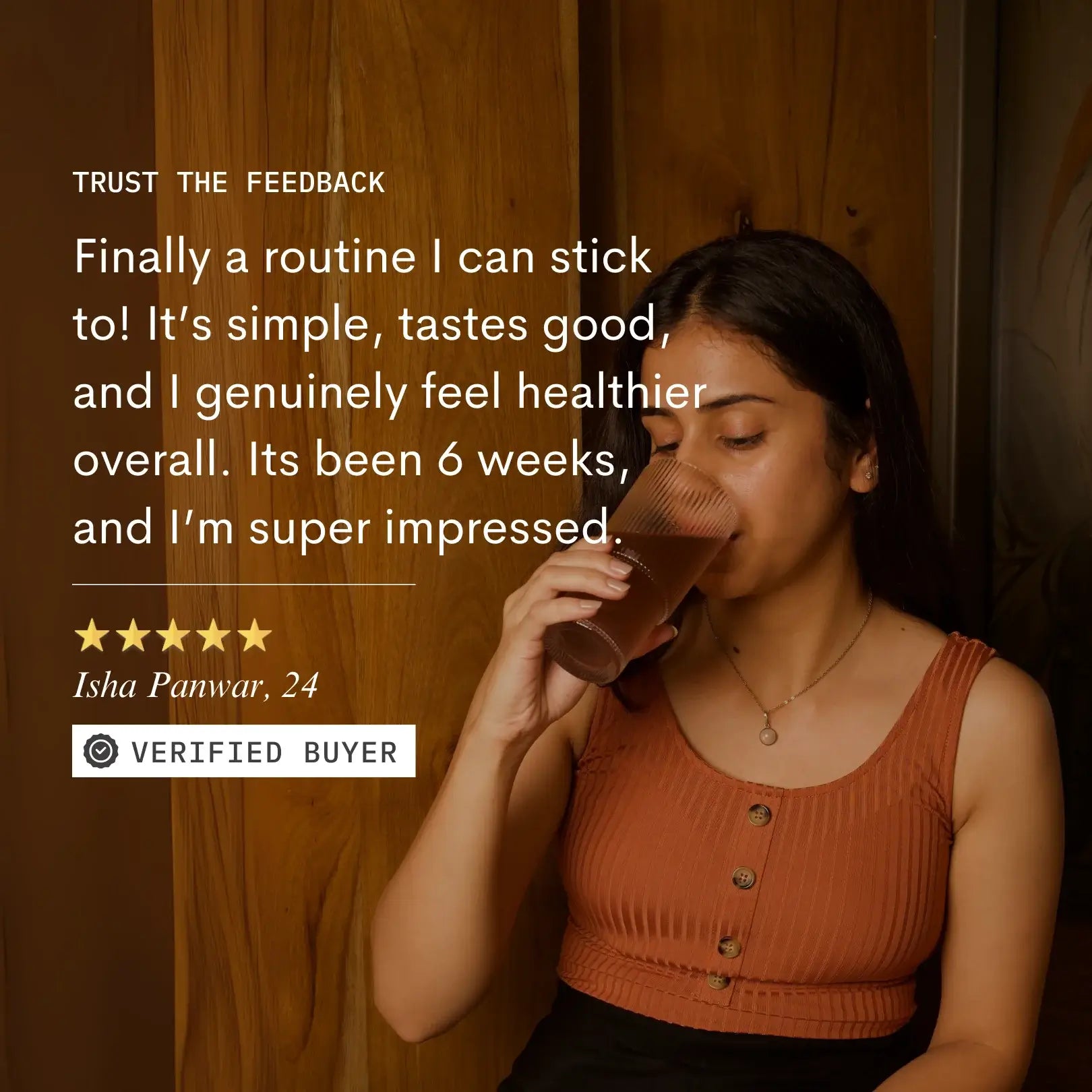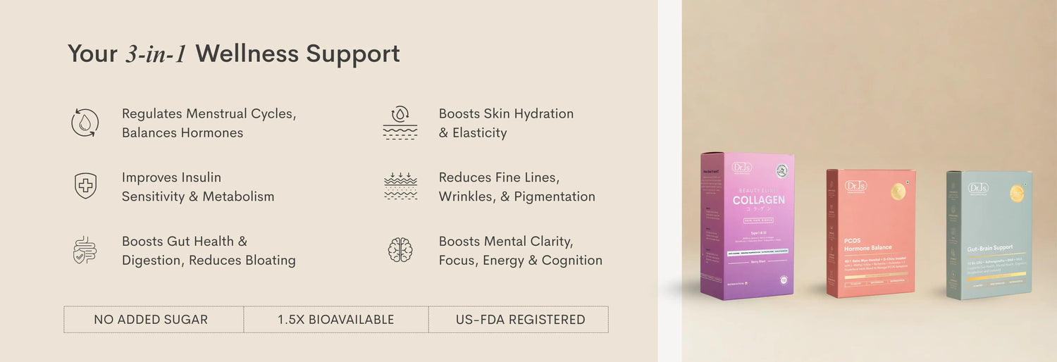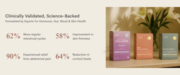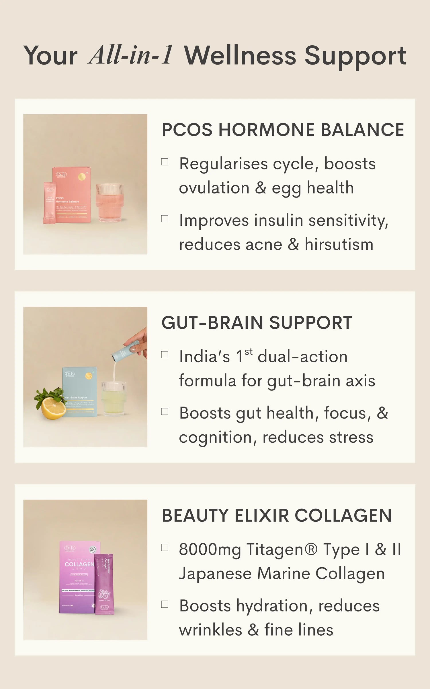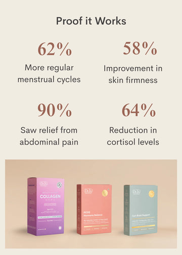 Most women start to see visible benefits from collagen in about 6–8 weeks, with improved skin glow and stronger hair and nails. The Gut-Brain probiotic usually shows effects on digestion, mood, and energy within 2–4 weeks. For the PCOS Hormone Balance supplement, cycle improvements and hormonal balance may take around 2–3 months of consistent use.