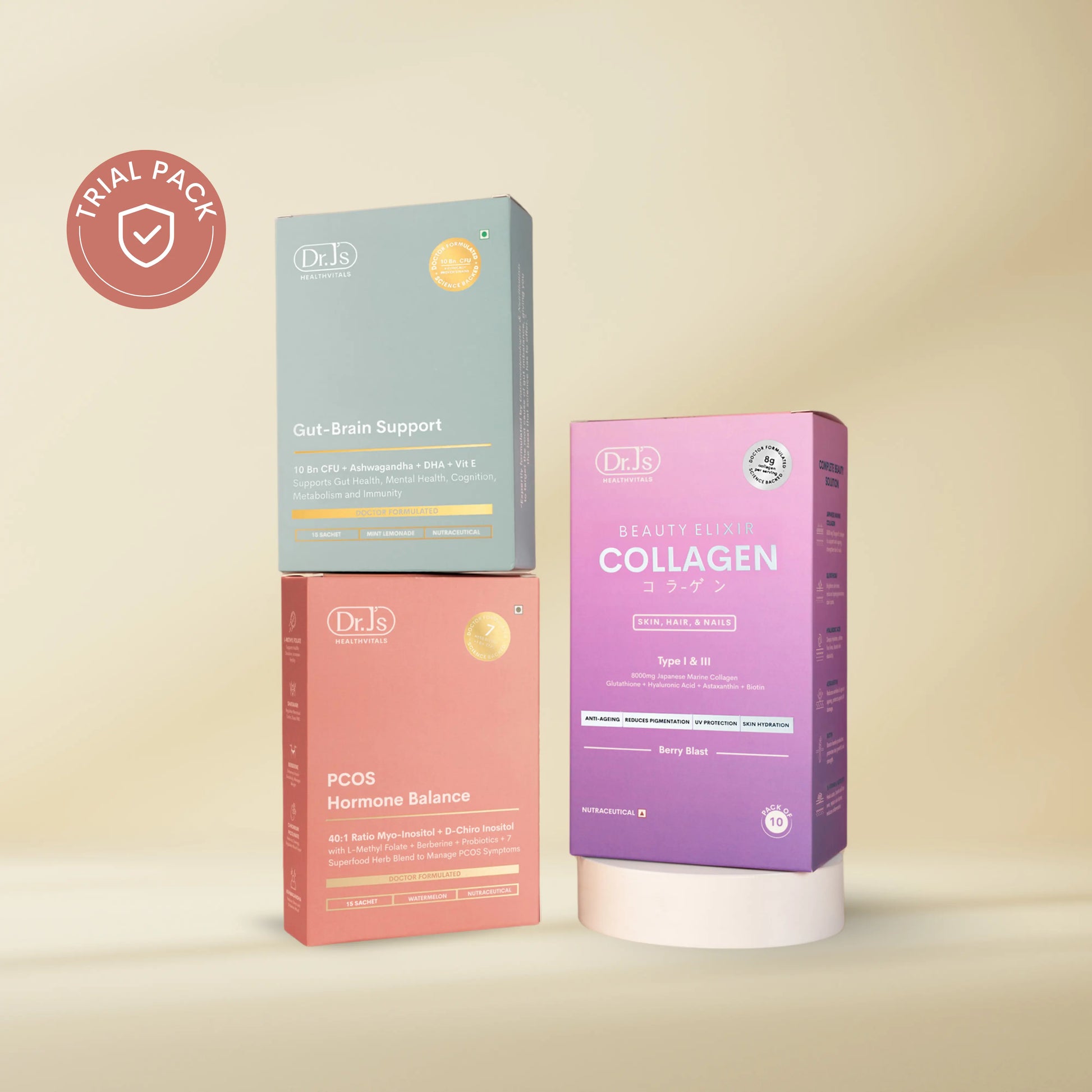 Take 1 sachet of PCOS Hormone Balance & 1 sachet of Gut-Brain Support probiotic daily, before meals, or as advised by your healthcare professional. Beauty Elixir Collagen can be taken any time of the day. Consistency is key for supporting gut health, hormone balance, and skin vitality.