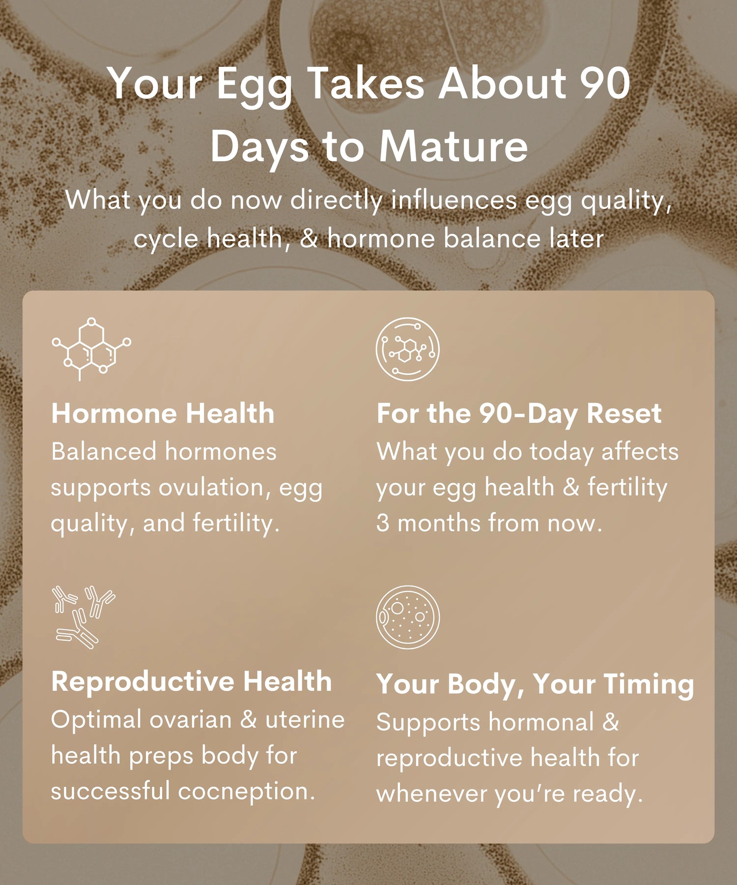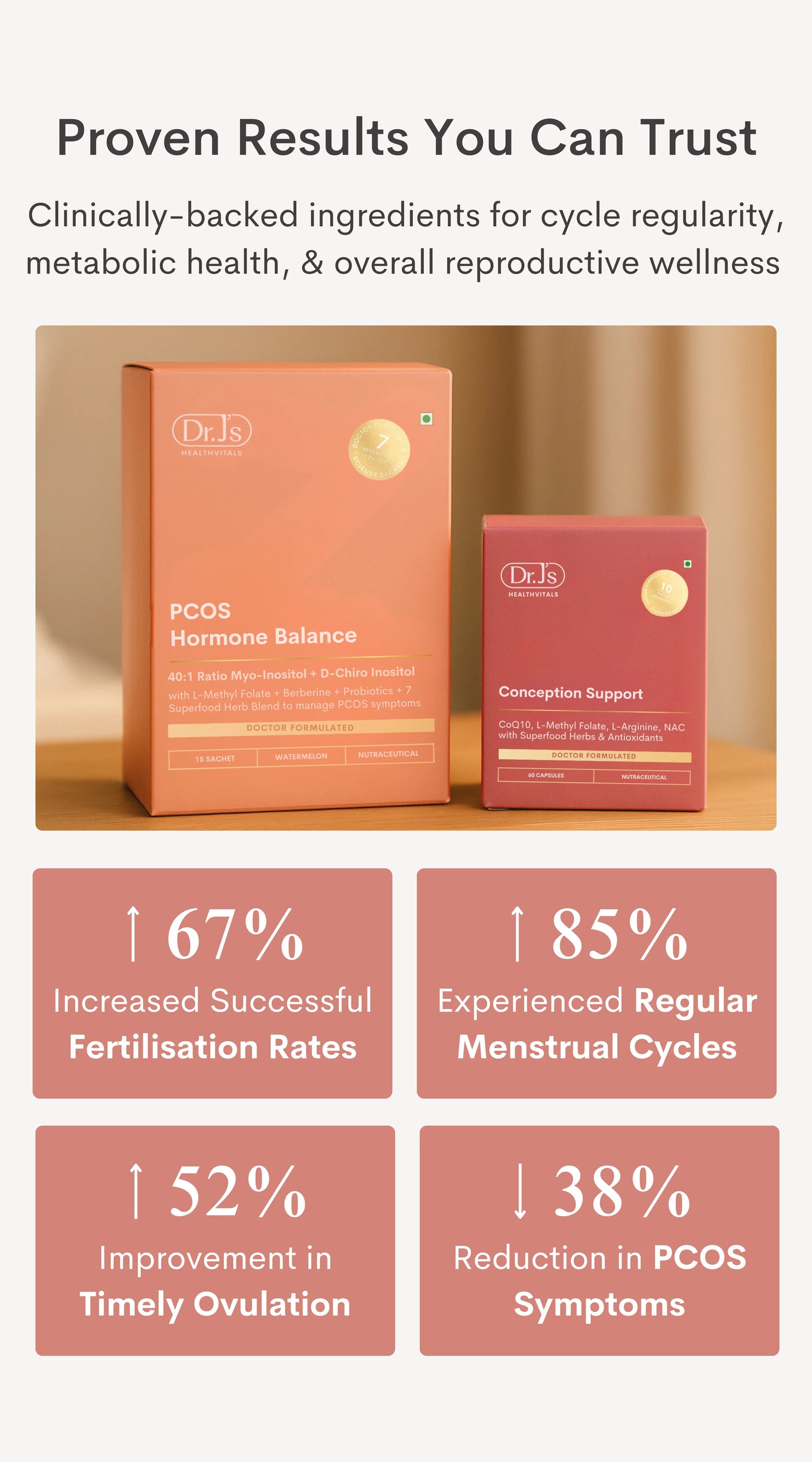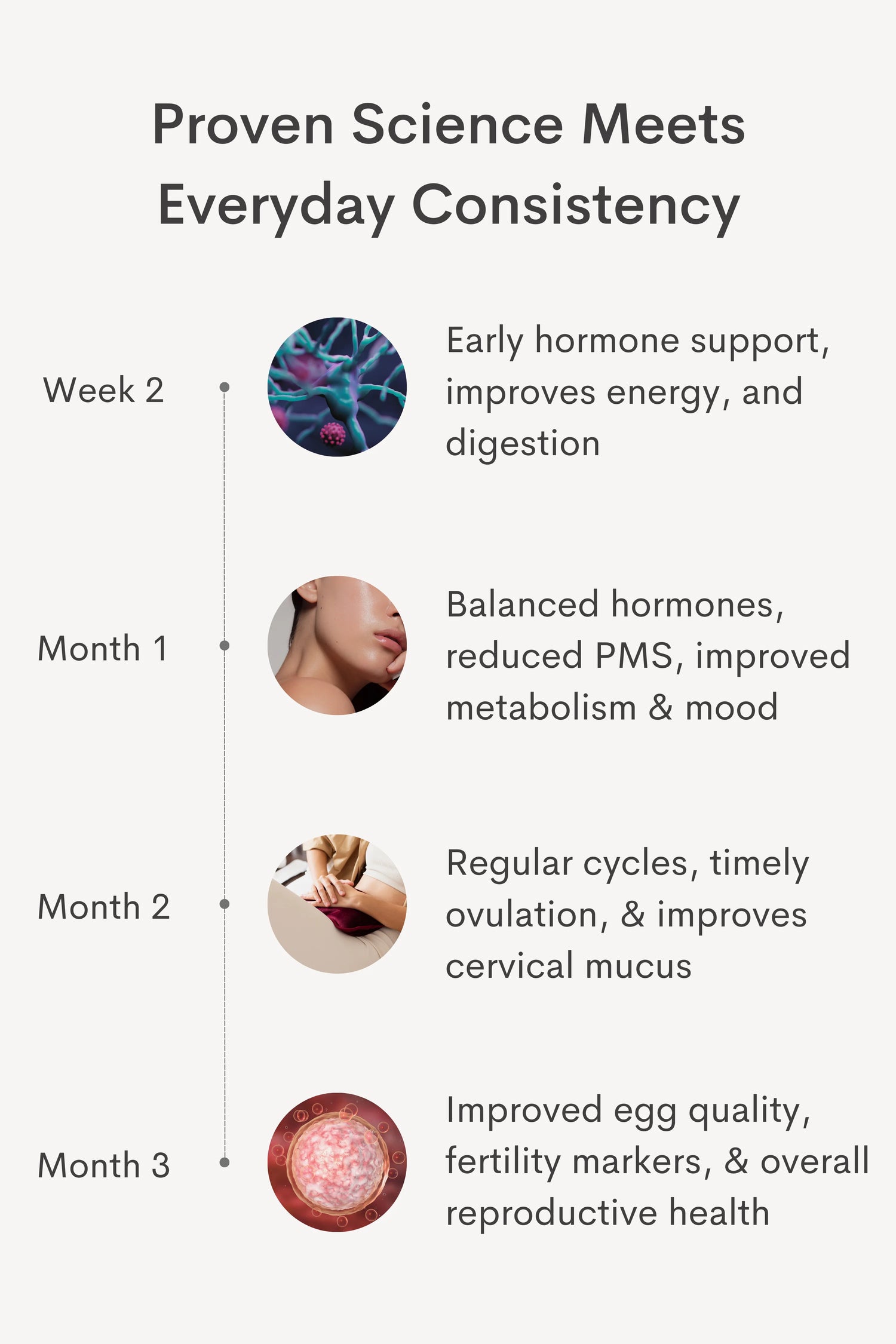 Most women begin to notice better energy, mood, and metabolic health within 4 to 6 weeks. With consistent use, cycles start to become more regular, PMS eases, and hormonal balance improves. By month 3, egg quality, ovulation, and uterine health show measurable improvements, and you may also notice positive changes in fertility markers such as AMH levels, & FSH balance, helping your body prepare for conception naturally.