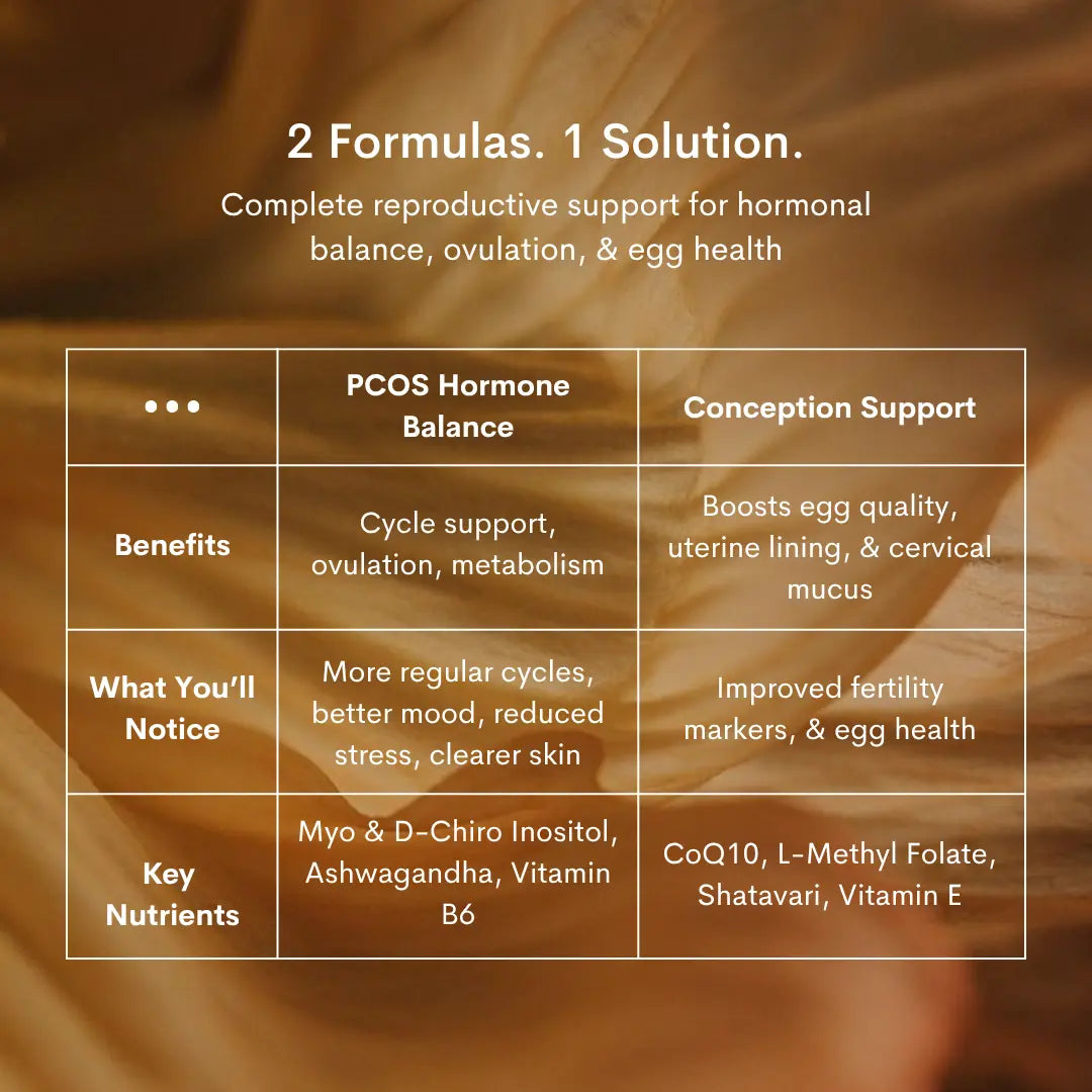 Prepare your body for conception by restoring hormonal balance, regulating cycles, and optimising fertility with a full-spectrum routine. Formulated by leading fertility specialists, this bundle pairs our PCOS & Hormone Balance formula with Conception Support to improve egg quality, strengthen the uterine lining, and support healthy ovulation, addressing every stage of reproductive wellness from cycle harmony to pregnancy readiness.