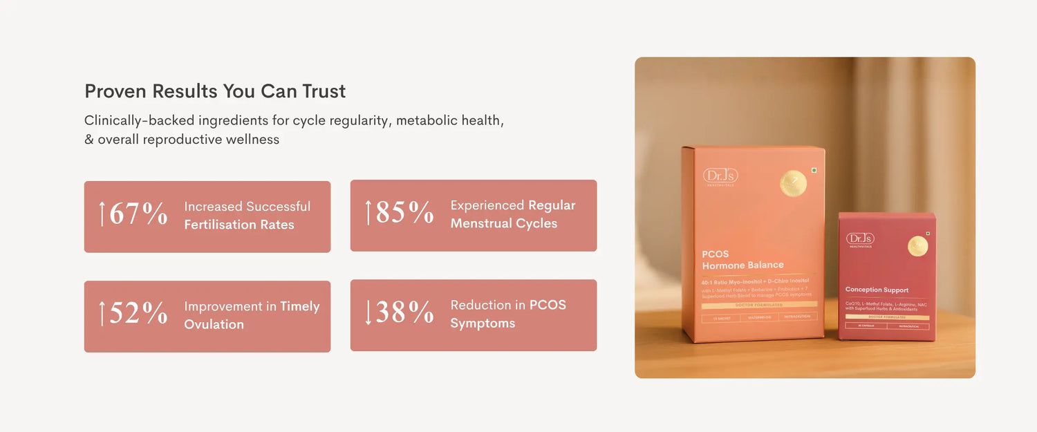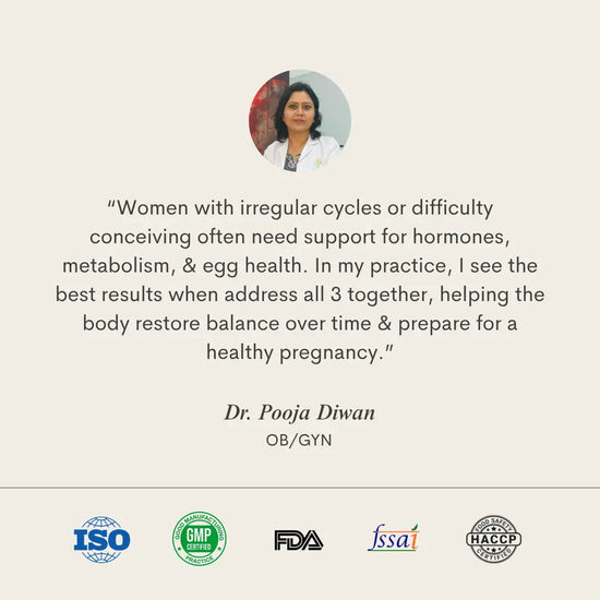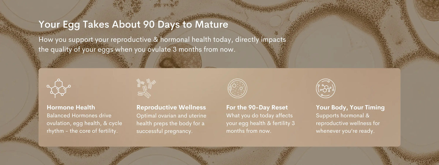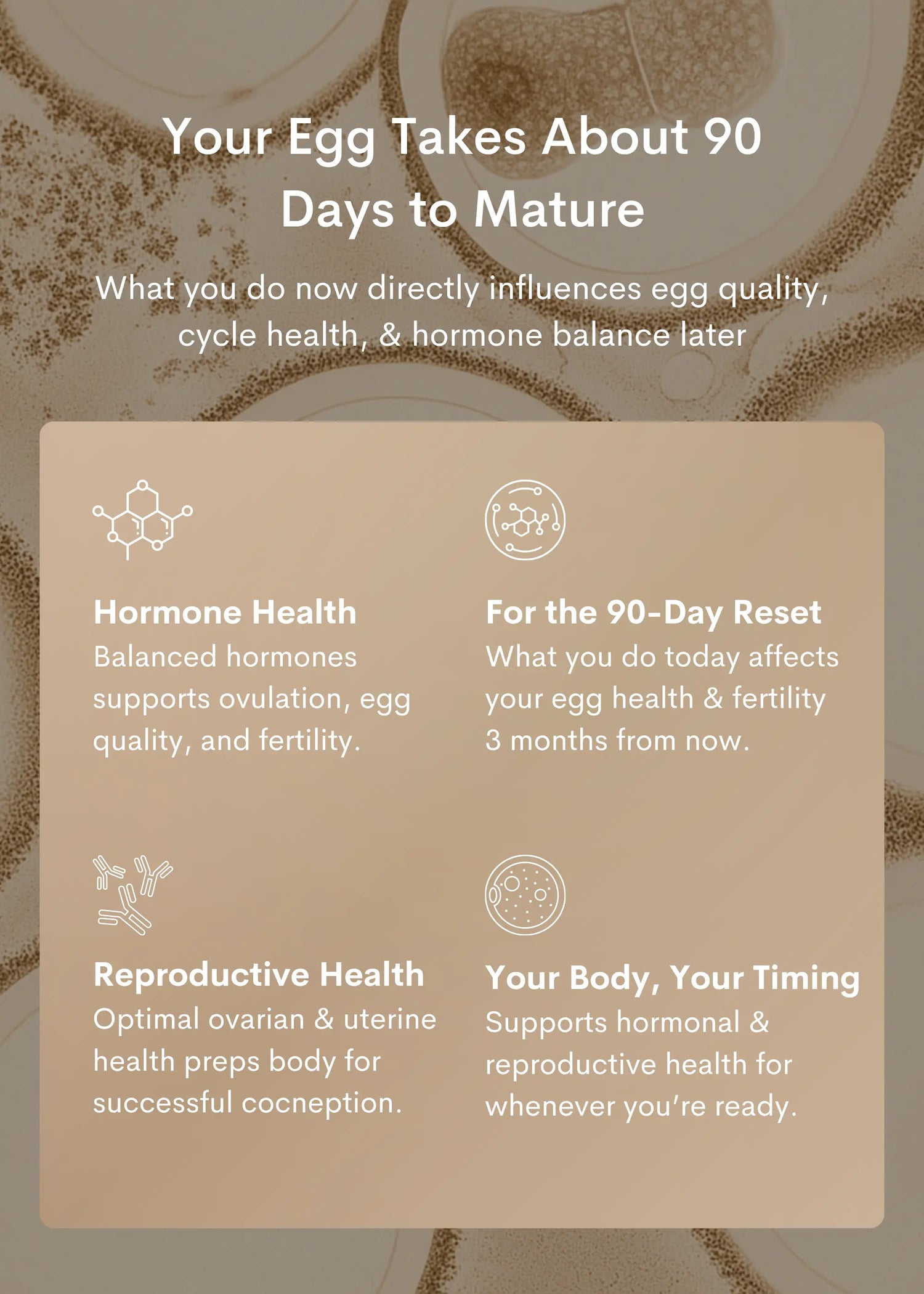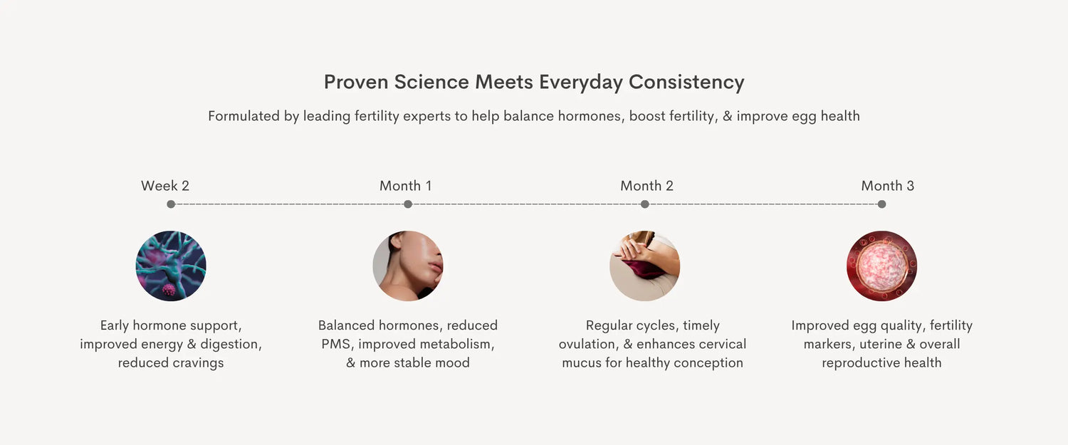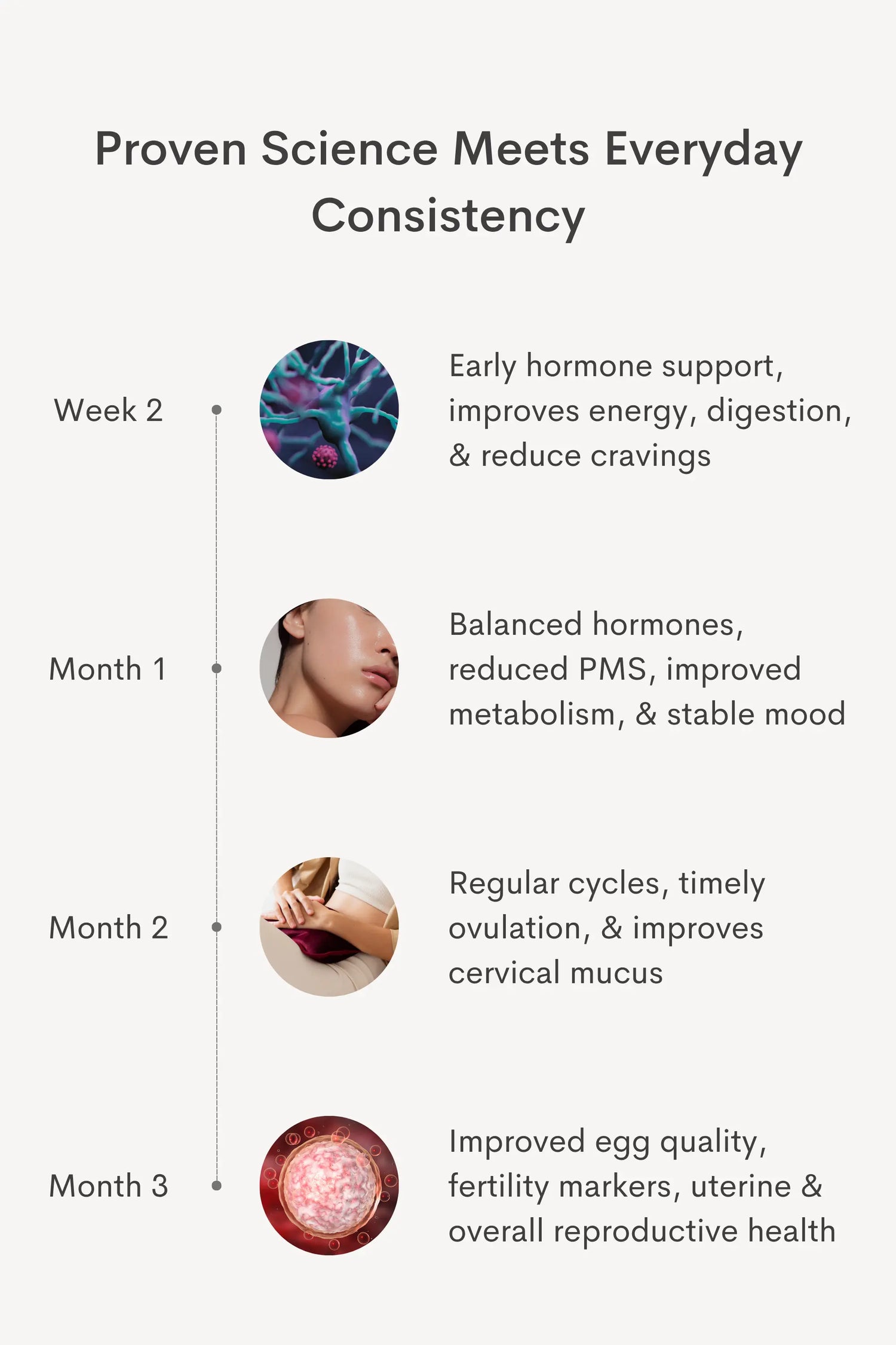 Most women begin to notice better energy, mood, and metabolic health within 4 to 6 weeks. With consistent use, cycles start to become more regular, PMS eases, and hormonal balance improves. By month 3, egg quality, ovulation, and uterine health show measurable improvements, and you may also notice positive changes in fertility markers such as AMH levels, & FSH balance, helping your body prepare for conception naturally.