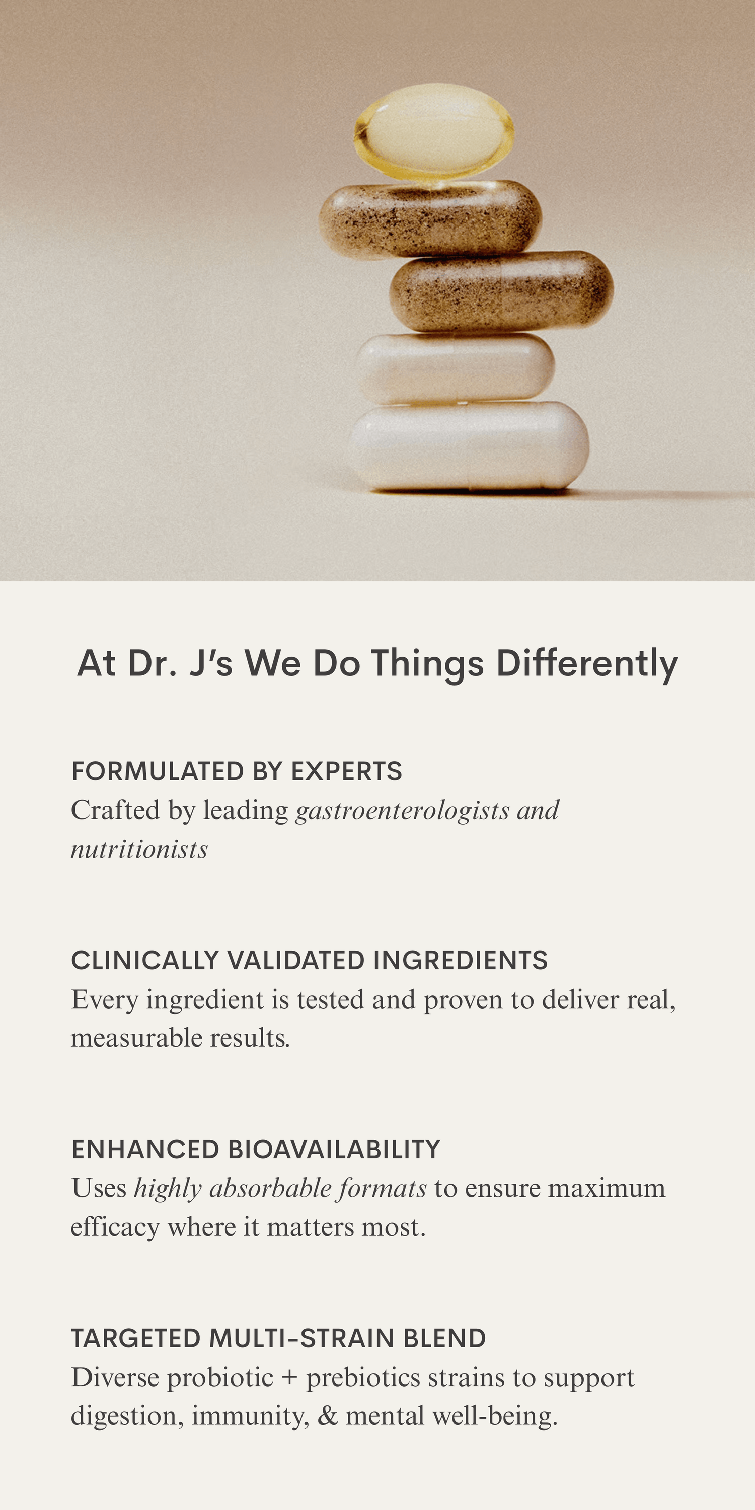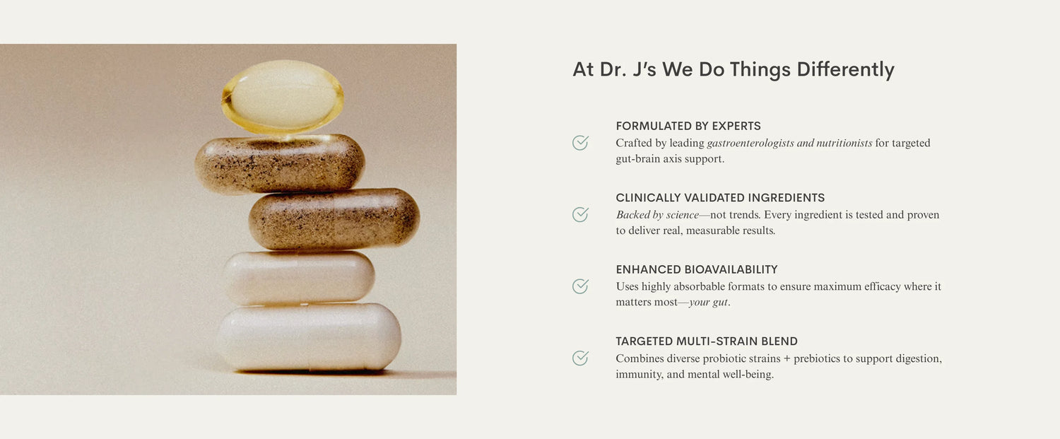 Dr. J’s Gut-Brain Support promotes a balanced gut microbiome, enhances digestion, and supports cognitive function & mood.
