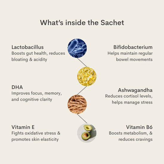 Good bacteria multiply, reducing inflammation and boosting metabolism for efficient weight management. DHA, ashwagandha and antioxidants enhance focus, reduce stress, and start improving skin from within.