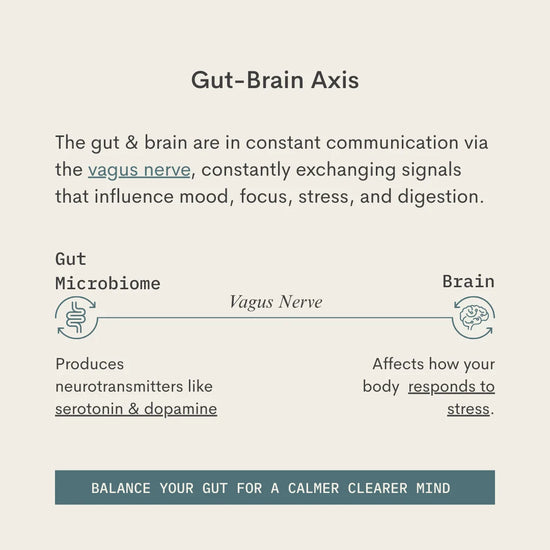 Your gut and brain are in constant communication through the gut-brain axis, where over 90% of serotonin is produced. When your gut is imbalanced, this axis is out of sync, showing up as stress, anxiety, lack of focus, or stubborn bloating.
