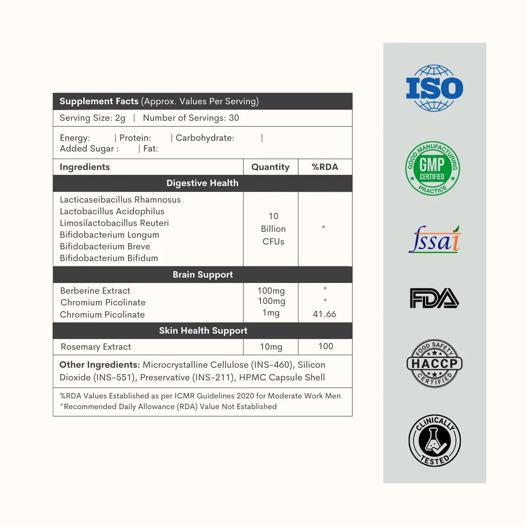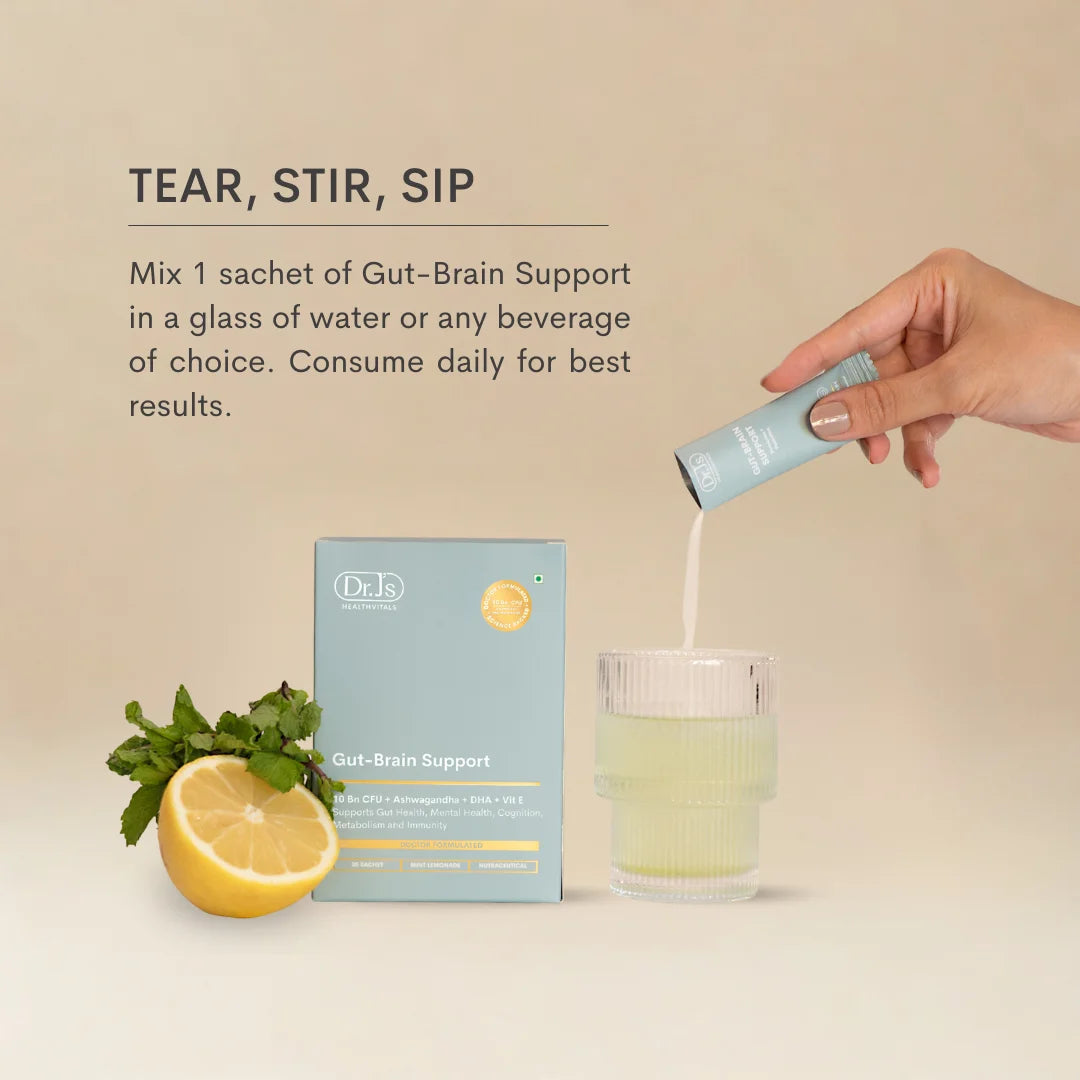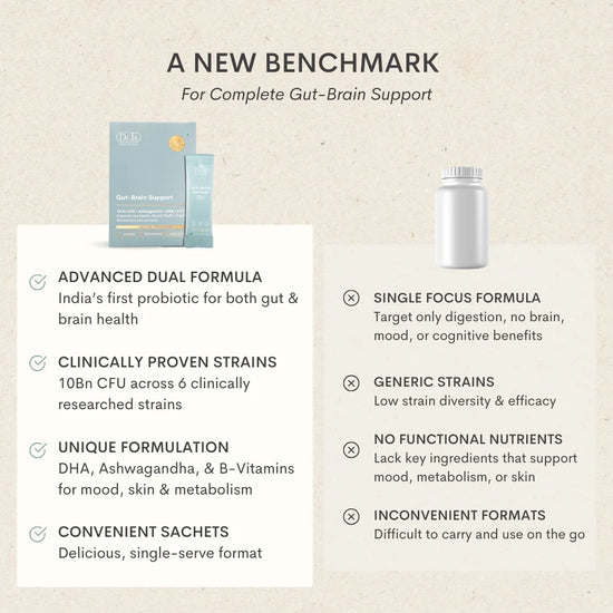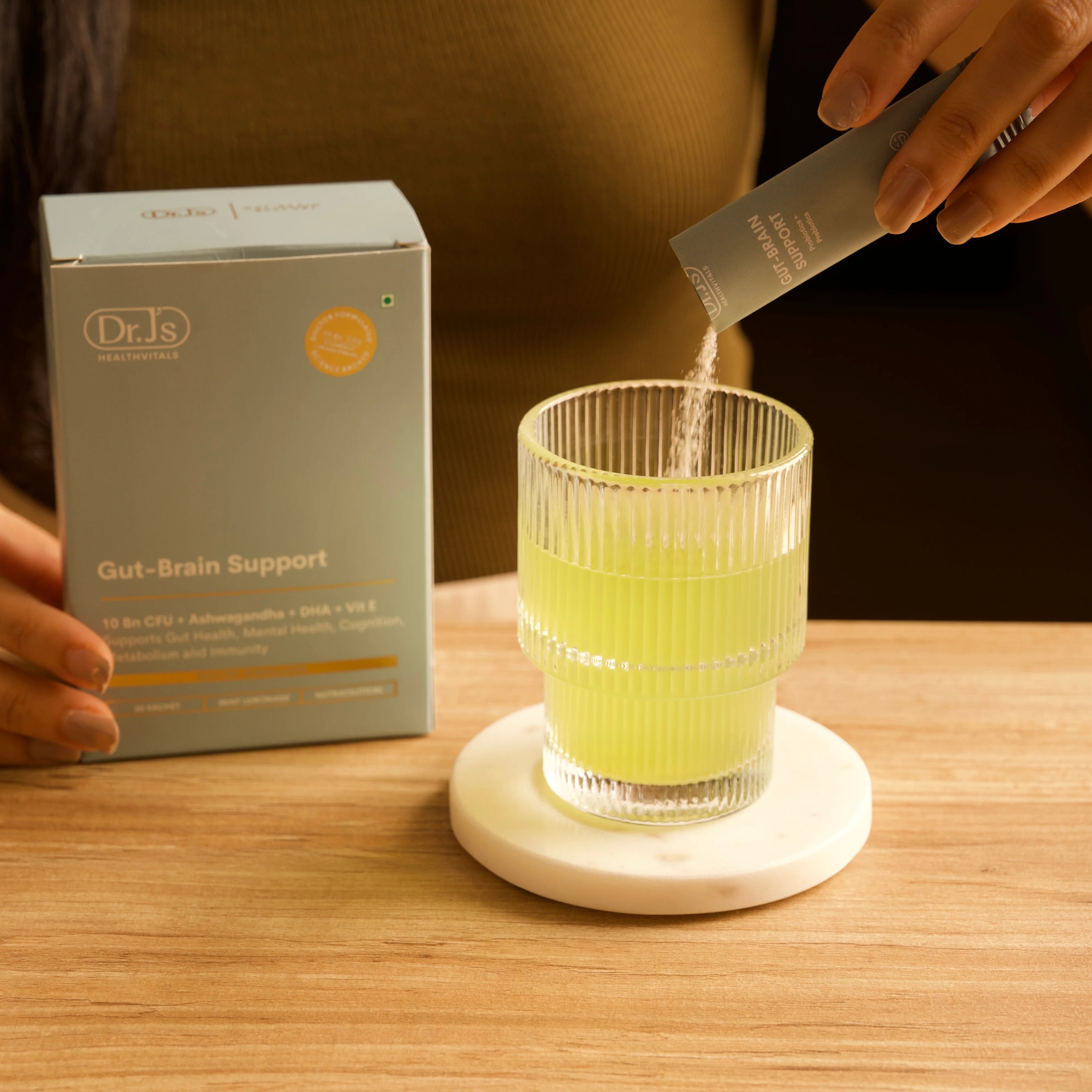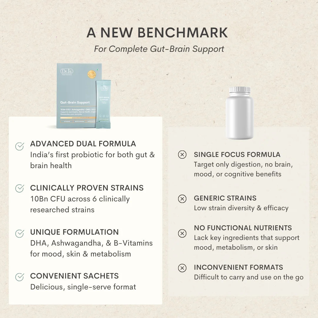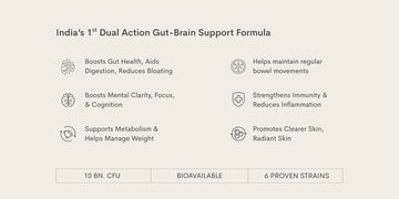 Gut-Brain Support by Dr. J’s is India’s first dual action probiotic formula packed with 10 billion CFU of 6 clinically proven strains, designed to balance the gut-brain axis, enhancing both gut health and mental well-being.